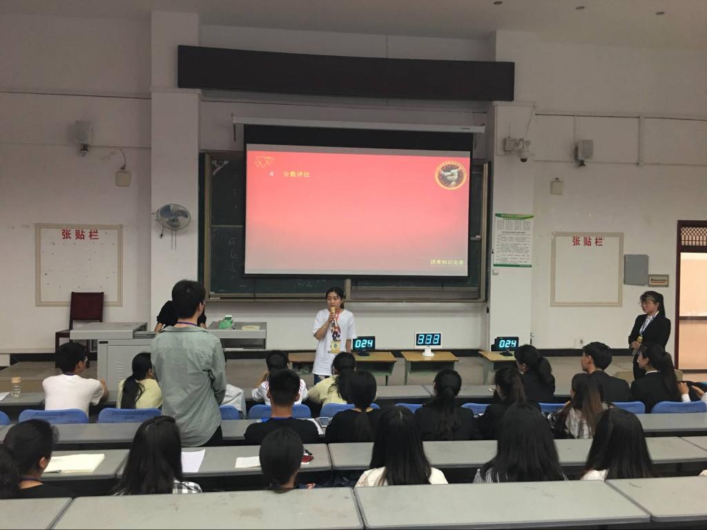 首先,全体起立唱团歌。由主持人宣读比赛环节和规则。比赛分为两个环节,第一个环节为必答环节,共五十题,题目在主持人读题完毕后,选手需在三十秒内答完,否则不得分。第二个环节为抢答环节,抢答环节中两系代表皆踊跃参与抢答。最后,经过统计文传系以48分的成绩领先管理系,进入决赛。在阵阵鼓励和祝贺的掌声中,本次活动圆满结束。